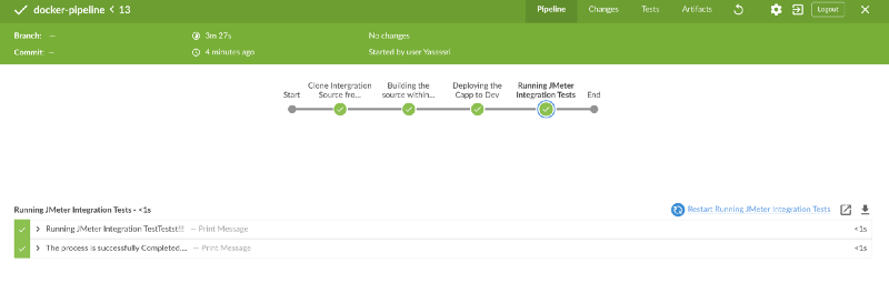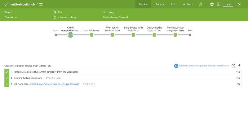 So let’s look at the implementation. The pipeline will first clone the integration source code from Github, then it will start an MI Container and then build the source with unit tests. The units tests will run on the MI container we are starting. Additionally we can deploy the artefacts to a lower environment and run integration tests on top of the integrations as well. The pipeline will simply look something similar to below.