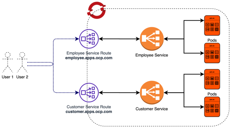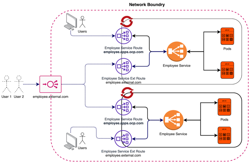From the above diagram, it seems like a simple thing to do but it isn’t. As you can see I have two hostnames to access the services, one hostname for the internal users and one for the external users. Since Openshift routes rely on SNI information in the handshake to decide the service the request should be sent it’s not straight forward to achieve this.